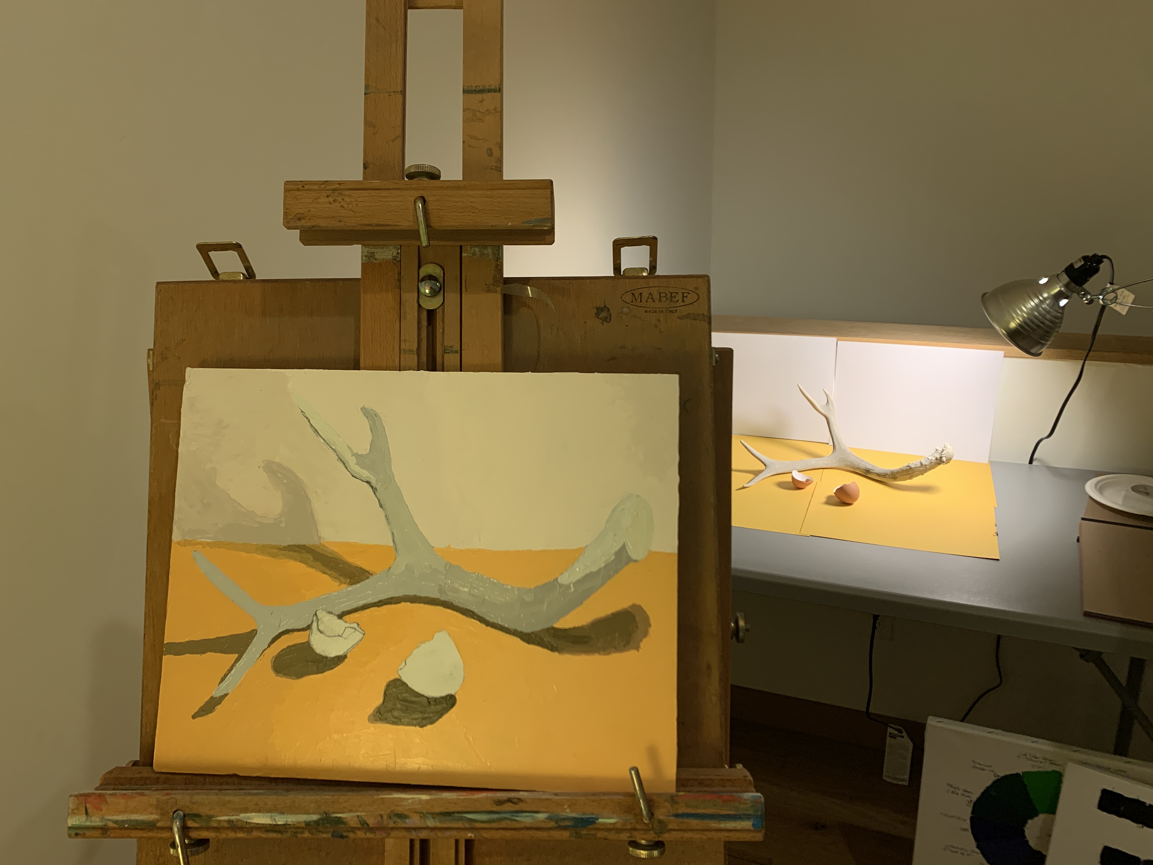 Process photos of Antler and Eggs, arcylic on board, 2021